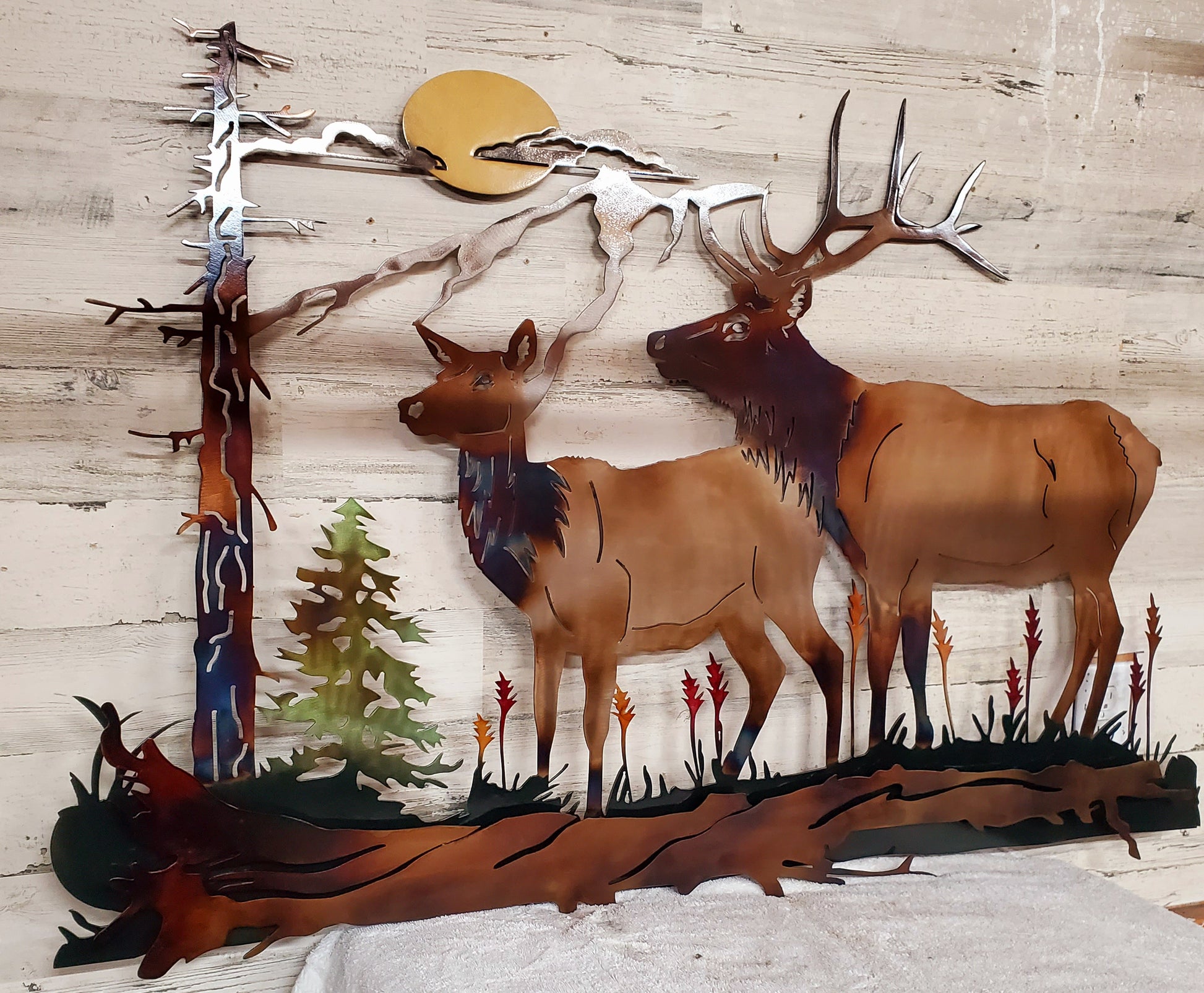 BULL ELK METAL WALL SCENE UNIQUE LARGE RUSTIC METAL ART WILDERNESS DECOR
